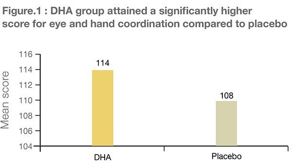 Children in the omega-3 FA supplemented group (n = 33) attained a significantly higher score for eye and hand coordination (mean ((SD) score 114 (10.2)) than those in the placebo group (n = 39, mean score 108 (SD 11.3); p = 0.021, adjusted p = 0.008) (see Fig.1).